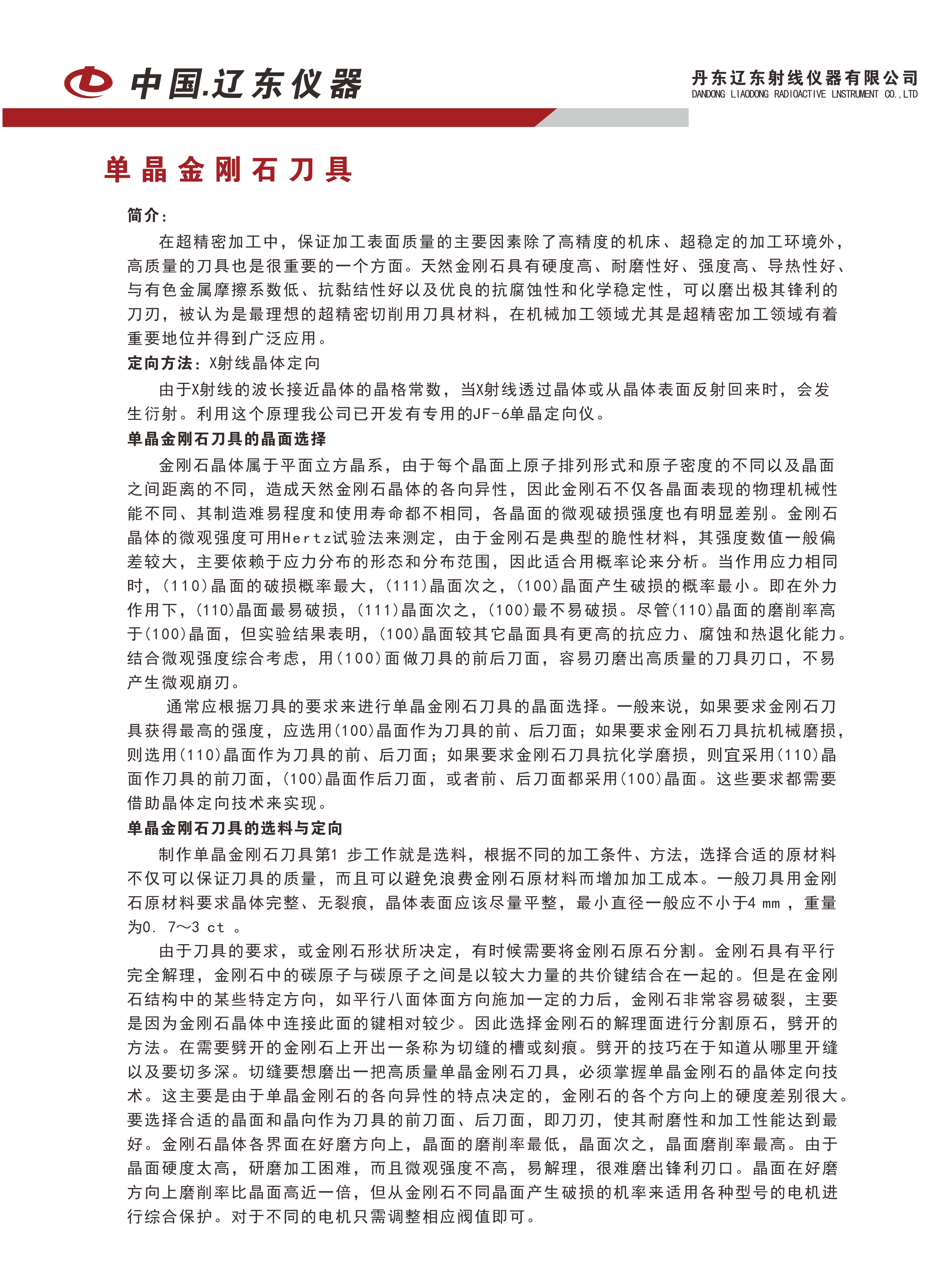 通常應(yīng)根據(jù)刀具的要求來進(jìn)行單晶金剛石刀具的晶面選擇。一般來說,如果要求金剛石刀具獲得最高的強(qiáng)度,應(yīng)選用(100)晶面作為刀具的前、后刀面;如果要求金剛石刀具抗機(jī)械磨損,則選用(110)晶面作為刀具的前、后刀面;如果要求金剛石刀具抗化學(xué)磨損,則宜采用(110)晶面作刀具的前刀面,(100)晶面作后刀面,或者前、后刀面都采用(100)晶面。這些要求都需要借助晶體定向技術(shù)來實(shí)現(xiàn)。