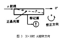 當(dāng) X< H時(shí), A為負(fù)值 ( 見圖 4) , 此時(shí) X= H A 應(yīng)按圖中所示旋轉(zhuǎn)方向來(lái)校正晶向。-